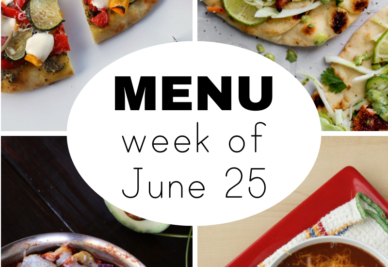 Last Week of June Dinner Menu Monday: Roasted Vegetable and Pesto Flatbread Pizzas Grapes Snack: Peanut butter and chocolate energy bites Tuesday: Blackened Salmon Green Salad Snack: Crackers and cheese wedges and pears Wednesday: Slow-Cooker Steak Chili The best cornbread ever Snack: Trail mix Thursday: One Pan Fried Egg Chilaquiles Chips and salsa Peaches Snack: Popcorn and clementines Friday:…