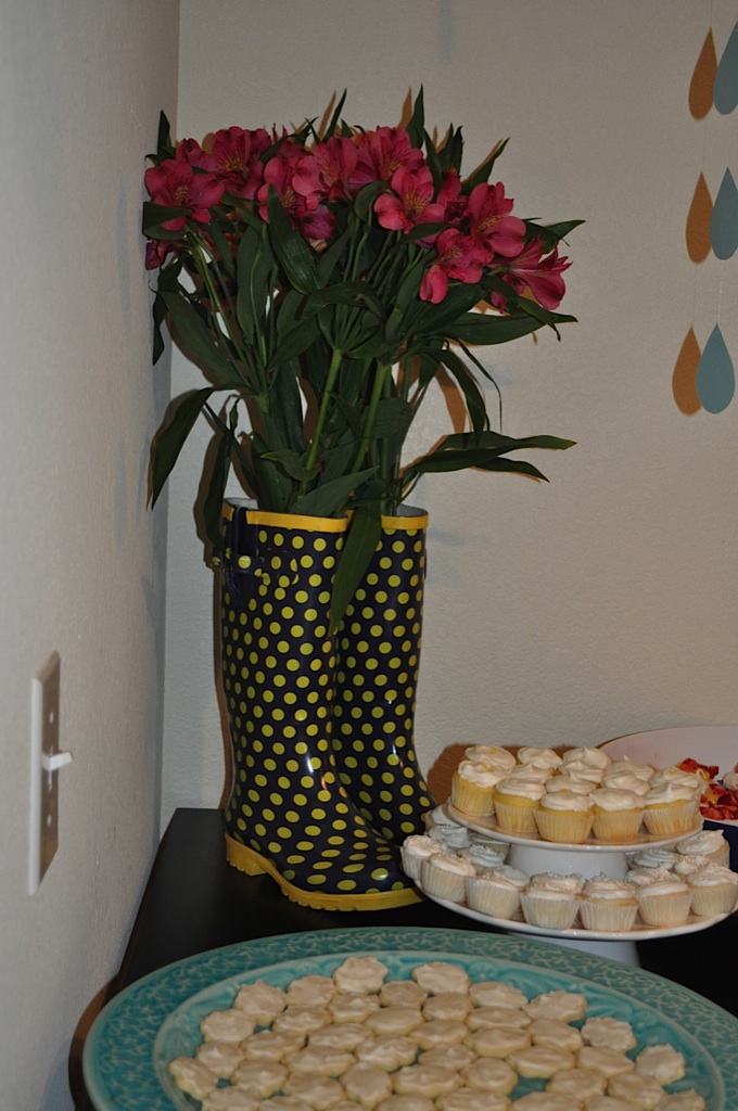 The rainboot vase idea is genius! What a clever way to fit in the theme. Looks like a fine time was had by all.