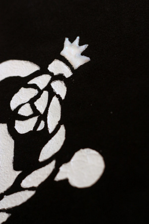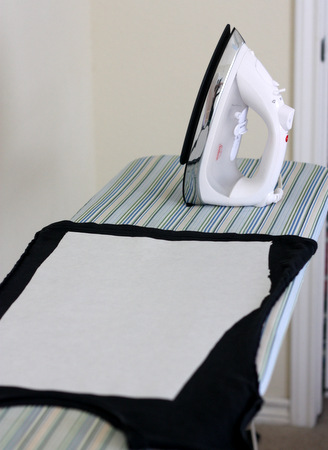 Then flip your shirt back right-side out and lay your freezer stencil, shiny side down, where you want it and iron it in place. Repeat about three times, being sure to press hard on all the little edges so you get a nice tight seal.