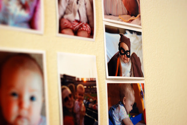 We printed 20 photos of Ella from the past year, trying to get a good representative sample. We did 5x7s which I think was a good call. Next time, though, I’d only do 12 photos (we did one wall with 12 photos and another wall with seven photos – one photo printed quite darkly, so we didn’t use it). We still have them on the wall and Ella points to them many times a day, wanting to be picked up so she can look closely at them.