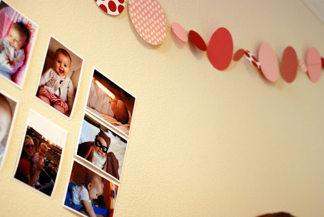 I also bought a couple of sheets of paper at Michaels and made a garland of different size circles (I geared everything toward pink and red polka dots), which I think turned out very nicely. Also, easy.