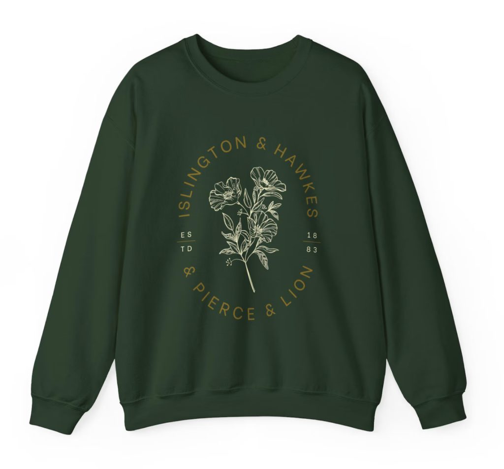 I love this cozy sweatshirt with Islington, Hawkes, Pearce and Lion’s names on it. It would be so perfect to snuggle up with your favorite journal volume! It comes in six different colors.