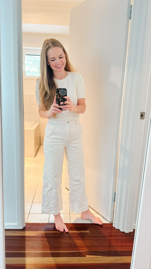 I bought this sweater on a whim a few weeks ago and I wore it nonstop before, during and after our trip to Australia (you can see it in the photo above). It goes with everything, dresses up and down, and doesn’t need a layer underneath. I’m a huge fan (it comes in a couple of colors – I picked white)!