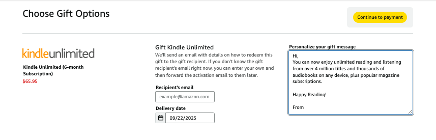 - You will then enter in the recipient’s email address and the date you want the Kindle Unlimited gift delivered.