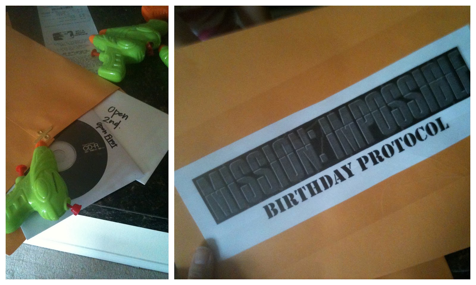 We packaged the CDs in large manilla envelopes along with additional instructions about location and time and a tiny water gun, and then sealed the whole thing with a “Mission Impossible: Birthday Protocol” sticker and then the other couple ding-dong-ditched them on the doorsteps of everyone on our invite list.
