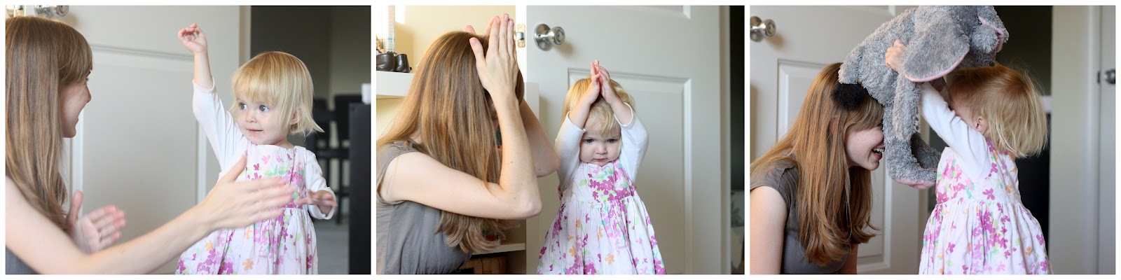 - Willoughby, Wallaby Woo – We have a stuffed elephant that Ella carries around and places on our heads during this song. I sing our names loudly over the music and then (because there are only two of us), I sing things like “Willoughby Wallaby Woor, an elephant sat on the floor” and so on with objects (bench, chair, shelf, blanket) around our living room.