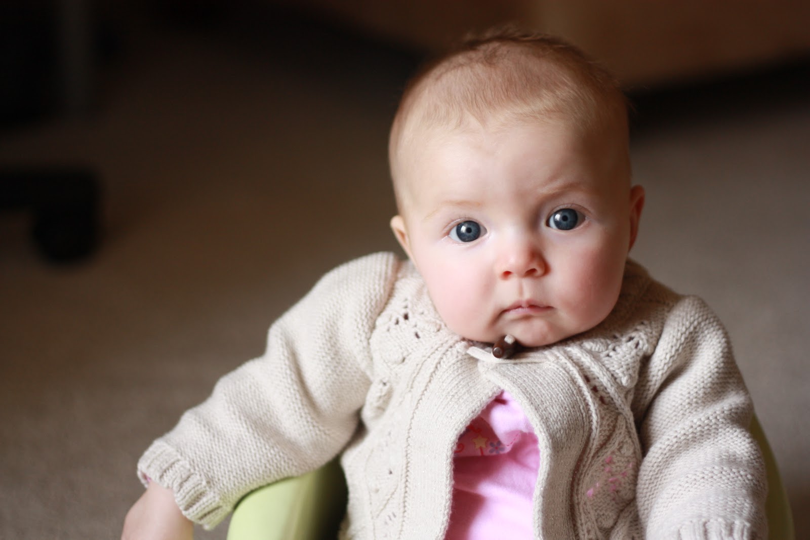 cutest little girl ever. i love the sweet sweater and that no-neck smunchy lovey baby phase. what a darling little expression.